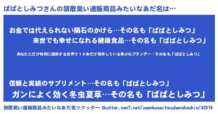 | ヘコむあだ名 | 『ばばとしみつ(苦笑)』『ばば太郎』 |