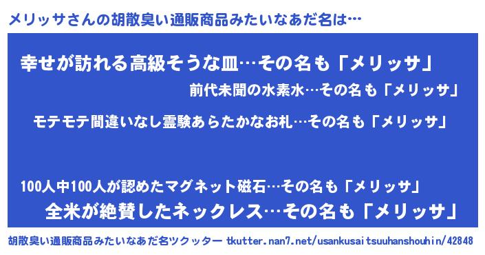 | 意味不明あだ名 | 『ペロリンメリッサ』『永久保存メリッサ』 |