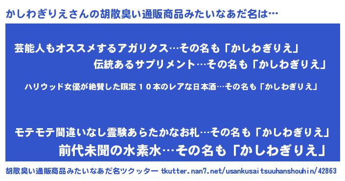 | ヘコむあだ名 | 『かしわぎりえ(苦笑)』『かしっぺ』 |