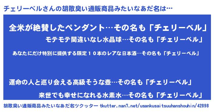 | 男性向けラノベタイトル風あだ名 | 『この素晴らしい世界にチェリーベルを!』 |