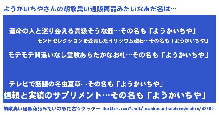 | 男性向けラノベタイトル風あだ名 | 『ようかいちやの憂鬱』 |