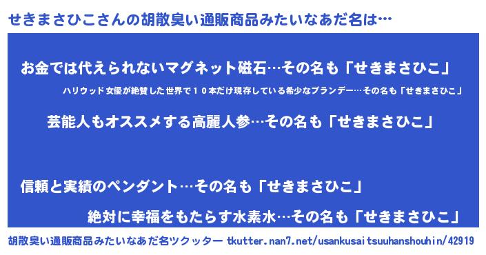 | ヘコむあだ名 | 『せきまさひこ(笑)』『せきお』 |