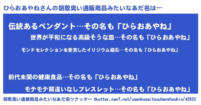 | 男性向けラノベタイトル風あだ名 | 『ノーゲーム・ノーヒラオアヤネ』 |