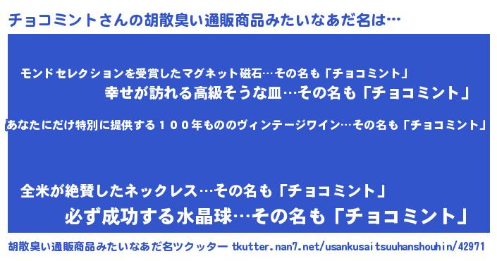 | 意味不明あだ名 | 『住所不定無職チョコミント(10歳)』 |