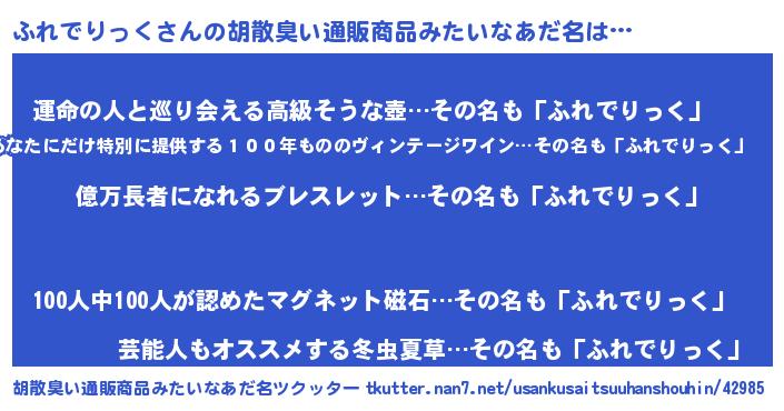 | 男性向けラノベタイトル風あだ名 | 『ふれでりっく~年齢イコール彼女いない歴の魔法使い~』 |