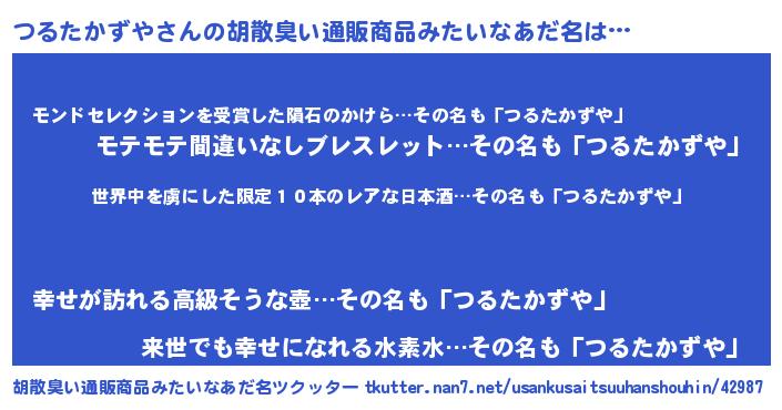 | 意味不明あだ名 | 『住所不定無職つるたかずや(39歳)』 |