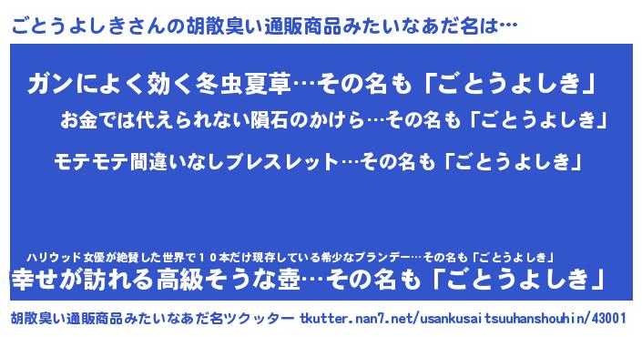 | 男性向けラノベタイトル風あだ名 | 『ごとうよしきに滅ぼされるだけの簡単なお仕事です』 |