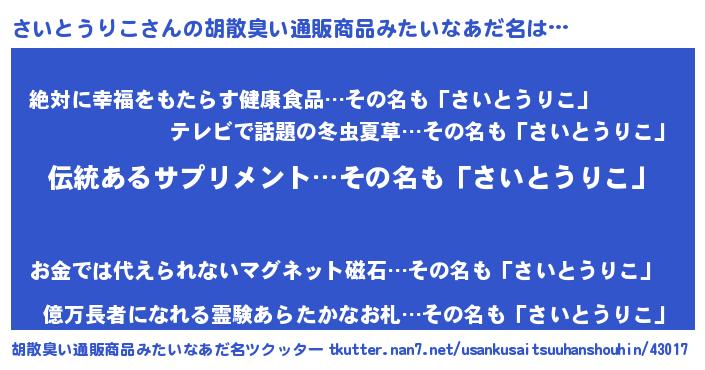 | 意味不明あだ名 | 『とにかく怪しいさいとうりこ』 |