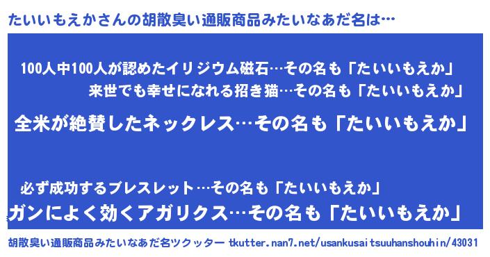 | 欧米人風あだ名 | 『ウサインたいいもえか』 |