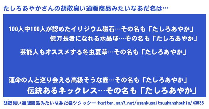 | 恥ずかしいあだ名 | 『タシロアヤカデラックス』『たしっちょ』 |