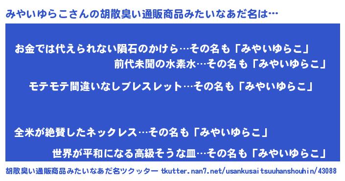| ヒーロー風カッコイイあだ名 | 『スーパーミヤイユラコ』『天弓騎士ミヤ』 |
