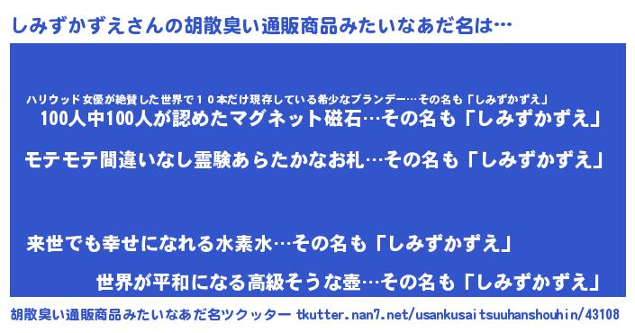 | 恥ずかしいあだ名 | 『プリティーしみずかずえ』『しみっちょ』 |