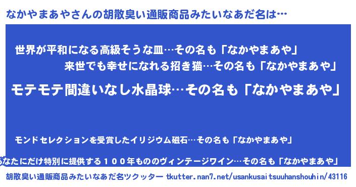 | 恥ずかしいあだ名 | 『プリティーなかやまあや』『なかっちょ』 |