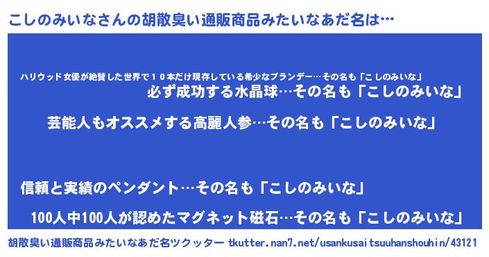| 男性向けラノベタイトル風あだ名 | 『Re:こしのみいなから始める異世界生活』 |