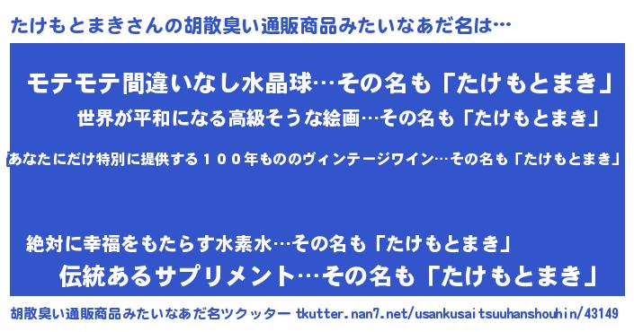 | 男性向けラノベタイトル風あだ名 | 『この素晴らしい世界にたけもとまきを!』 |