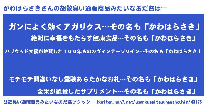 | ヘコむあだ名 | 『かわお』『かわはらさき(小並感)』 |