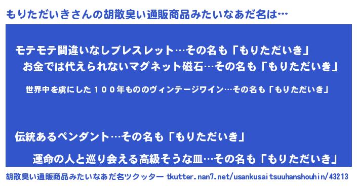 | 意味不明あだ名 | 『住所不定無職もりただいき(9歳)』 |