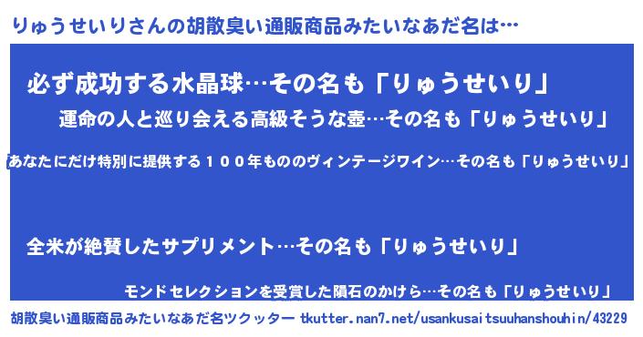 | 意味不明あだ名 | 『住所不定無職りゅうせいり(13歳)』 |