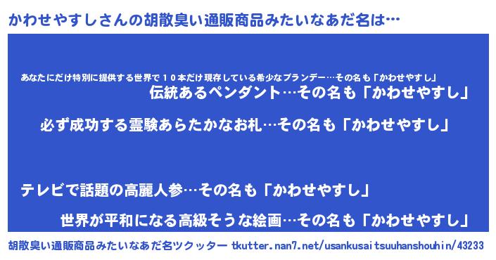 | 男性向けラノベタイトル風あだ名 | 『かわせやすしの憂鬱』 |