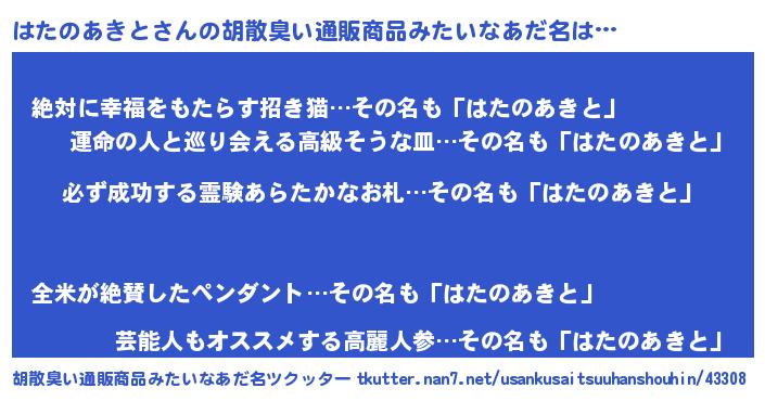 | ヘコむあだ名 | 『はたっふぃ~』『はたのあきと(小並感)』 |