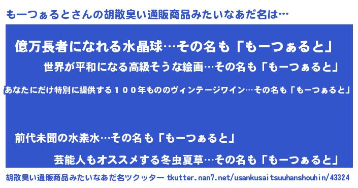 | 女子向けラノベタイトル風あだ名 | 『悪役もーつぁるとに転生したようですが、知った事ではありません』 |