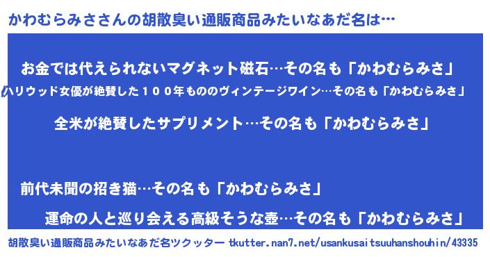 | 男性向けラノベタイトル風あだ名 | 『かわむらみさの嫁は女の子じゃないと思った?』 |