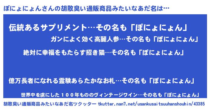 | 男性向けラノベタイトル風あだ名 | 『ぽにょにょんという概念が存在しない退屈な世界 』 |