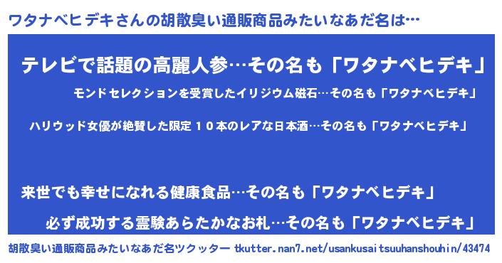 | ヒーロー風カッコイイあだ名 | 『仮面ワタダー』『ネオワタナベヒデキ』 |