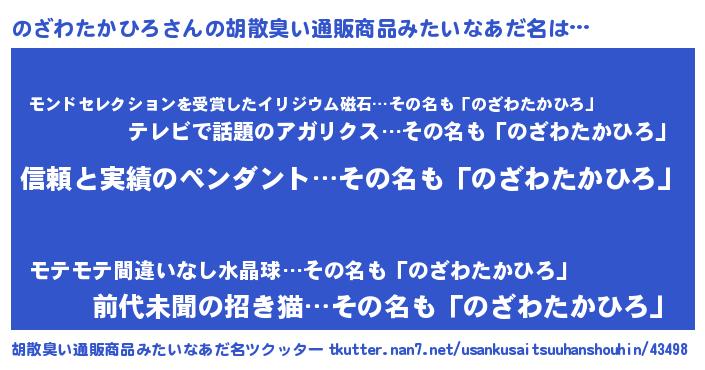 | ヘコむあだ名 | 『のざぷりん』『のざわたかひろ(震え声)』 |