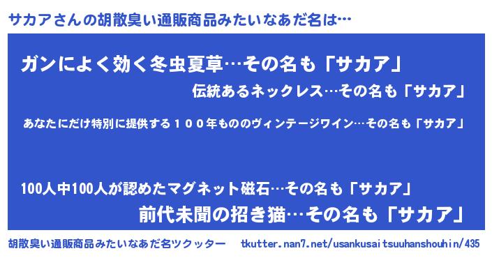 | 意味不明あだ名 | 『住所不定無職サカア(7歳)』『自称サカア』 |