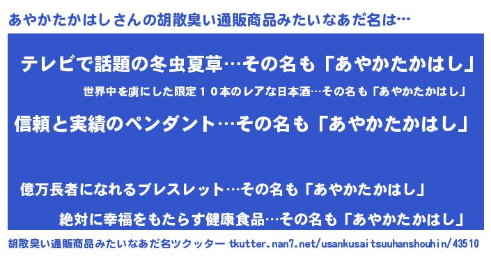 | ヘコむあだ名 | 『あやぷりん』『あやかたかはし(遠い目)』 |