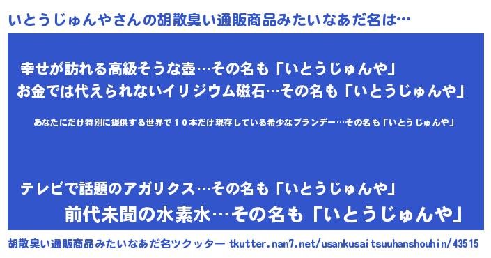| 男性向けラノベタイトル風あだ名 | 『この素晴らしい世界にいとうじゅんやを!』 |