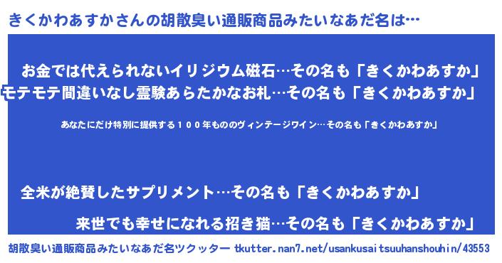 | 男性向けラノベタイトル風あだ名 | 『この素晴らしい世界にきくかわあすかを!』 |