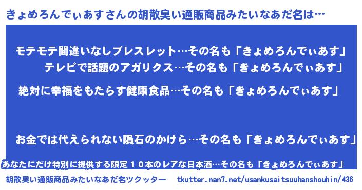 | ヘコむあだ名 | 『きょめろんでぃあす(爆)』『きょにー』 |