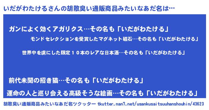 | 意味不明あだ名 | 『住所不定無職いだがわたける(59歳)』 |