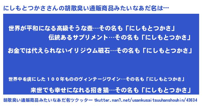 | ヘコむあだ名 | 『なまこ酢』『にしもとつかさ(苦笑)』 |