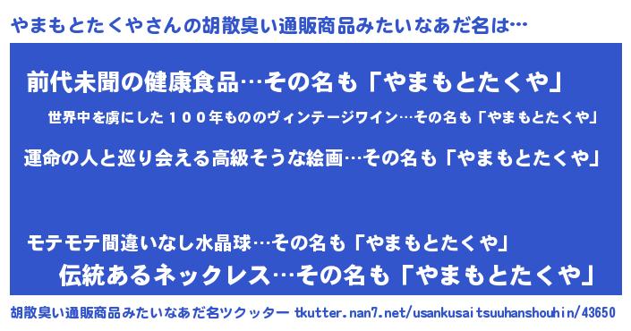 | 男性向けラノベタイトル風あだ名 | 『やまもとたくや~年齢イコール彼女いない歴の魔法使い~』 |