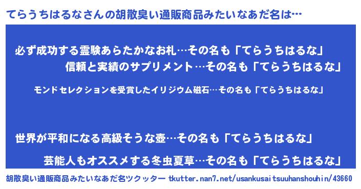 | 男性向けラノベタイトル風あだ名 | 『ノーゲーム・ノーテラウチハルナ』 |