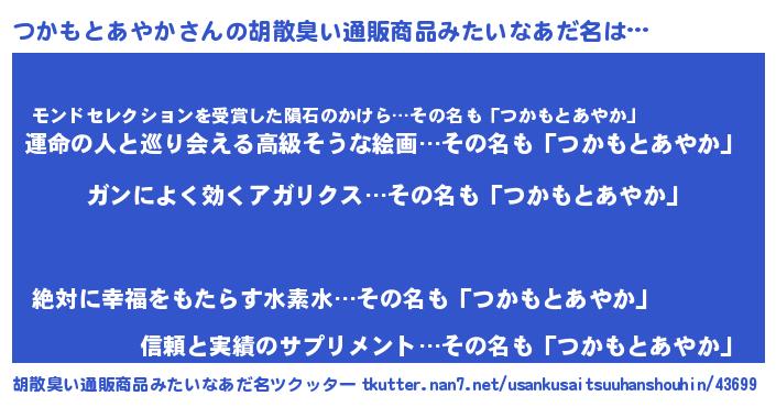 | 恥ずかしいあだ名 | 『ツカモトアヤカデラックス』『つかちん』 |