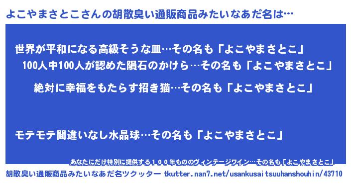 | ヘコむあだ名 | 『よこやまさとこ(小並感)』『酢こんぶ』 |