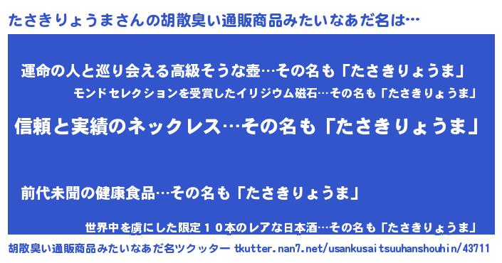 | 意味不明あだ名 | 『とにかく怪しいたさきりょうま』 |