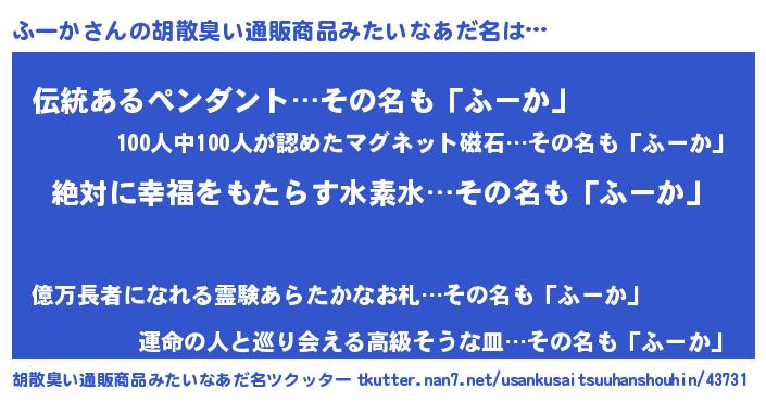 | ヘコむあだ名 | 『ふーか(苦笑)』『ふーっぺ』 |