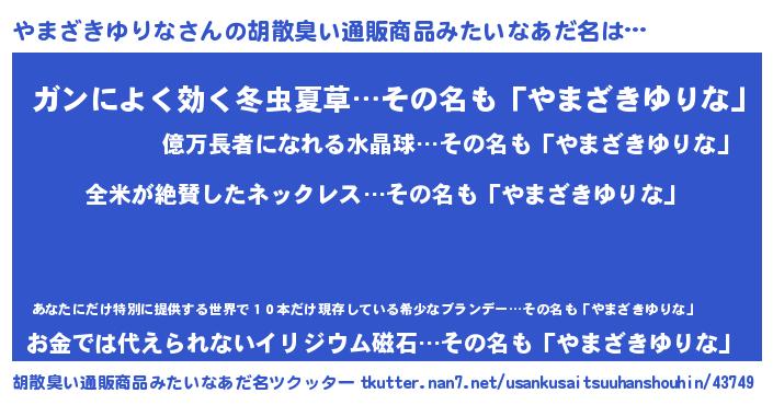 | 男性向けラノベタイトル風あだ名 | 『やまざきゆりな~年齢イコール彼女いない歴の魔法使い~』 |