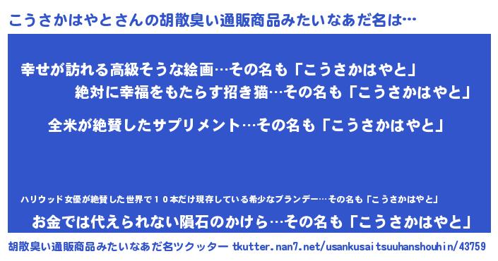 | 意味不明あだ名 | 『とにかく怪しいこうさかはやと』 |