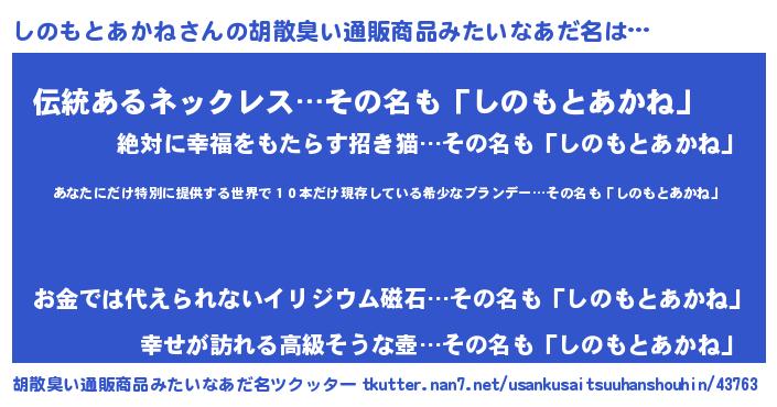 | 意味不明あだ名 | 『住所不定無職しのもとあかね(91歳)』 |