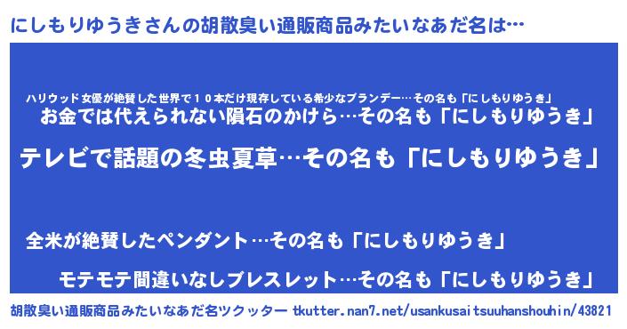 | 男性向けラノベタイトル風あだ名 | 『Re:にしもりゆうきから始める異世界生活』 |