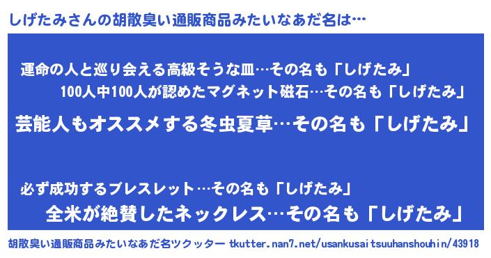 | ヘコむあだ名 | 『酢こんぶ』『しげっぺ』『しげにー』 |