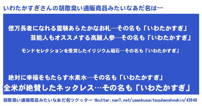 | ヒーロー風カッコイイあだ名 | 『慈愛の使者いわたかすぎ』 |