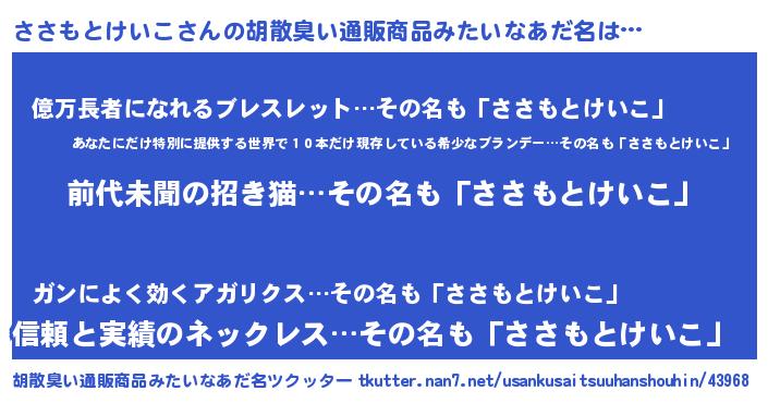 | ヘコむあだ名 | 『ささもとけいこ(小並感)』『ささにー』 |