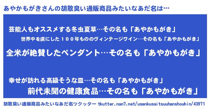 | ヘコむあだ名 | 『あやっちょ』『あやかもがき(苦笑)』 |